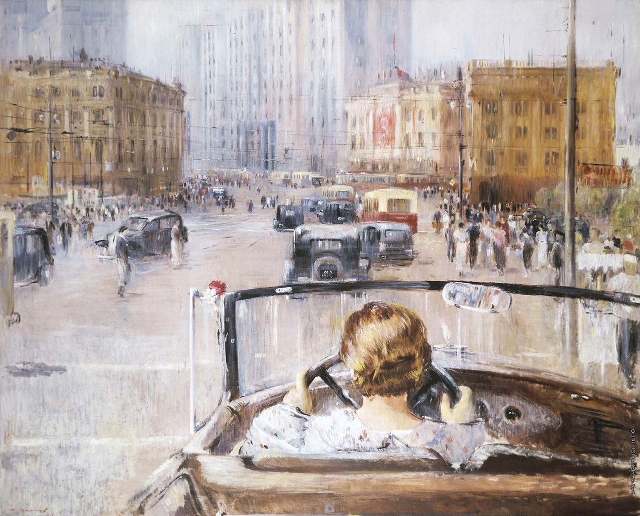 Юрий Иванович Пименов «Новая Москва», 1937 Третьяковская галерея, Москва Соцреализм Картина является частью серии работ о Москве, над которой художник работал с середины 1930-х годов. Художник изобразил площадь Свердлова (сейчас Театральная), расположенную в центре города, неподалеку от Кремля. Видны Дом Союзов и гостиница «Москва». Сюжет картины — женщина за рулём автомобиля — довольно редкое явление… Подробнее »