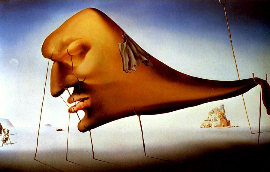 Сальвадор «Сон», 1937 На этой картине Дали изобразил большую и мягкую голову с отсутствующим телом. Спящему, олицетворяющему сон, необходимо множество подпорок, которые поддерживают голову и сохраняют черты лица. Подпорки говорят о хрупкости реальности, — даже собаке, нарисованной в левом нижнем углу картины, необходима подпорка, чтобы не упасть на землю. Голубой цвет картины усиливает обособленность от… Подробнее »