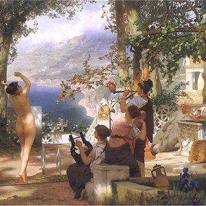 Генрих Семирадский «Танец среди мечей», 1881 Государственная Третьяковская галерея, Москва Академизм На картине изображена обнажённая женщина, танцующая среди мечей с остриями, направленными вверх. Ей аккомпанируют три женщины, одна из которых играет на кифаре, другая — на разновидности флейты (по-видимому, на авлосе, хотя также упоминается сиринга), а третья — на барабане (возможно, это тимпан). За танцем… Подробнее »