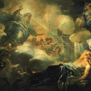 Лука «Сон Соломона», 1693 Молодому царю Соломону, лежащему на своем роскошном ложе, во сне явился Бог в сопровождении ангелов, изображенный на картине в водовороте облаков. Он передает Соломону свет божественной мудрости, которой впоследствии прославится царь. Над Соломоном изображена Минерва, богиня мудрости, она держит в руках книгу и ягненка, символы знания и настойчивости. Постройка на дальнем… Подробнее »